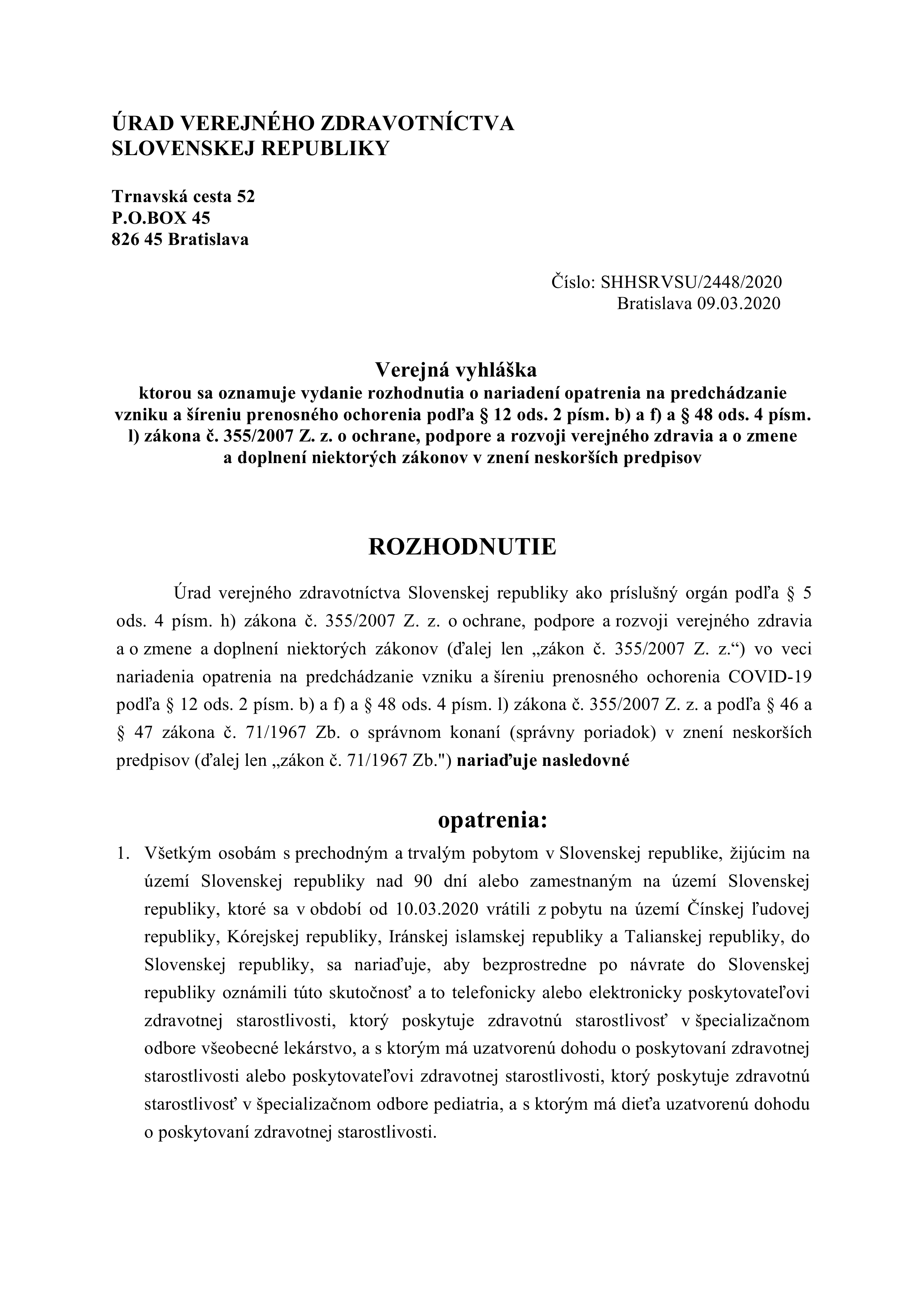 Rozhodnutie – karanténa – verejná vyhláška Pridane : 10. marca 202010. marca 2020 adminPridane v : COVID-19, Vyhláška, Zákon